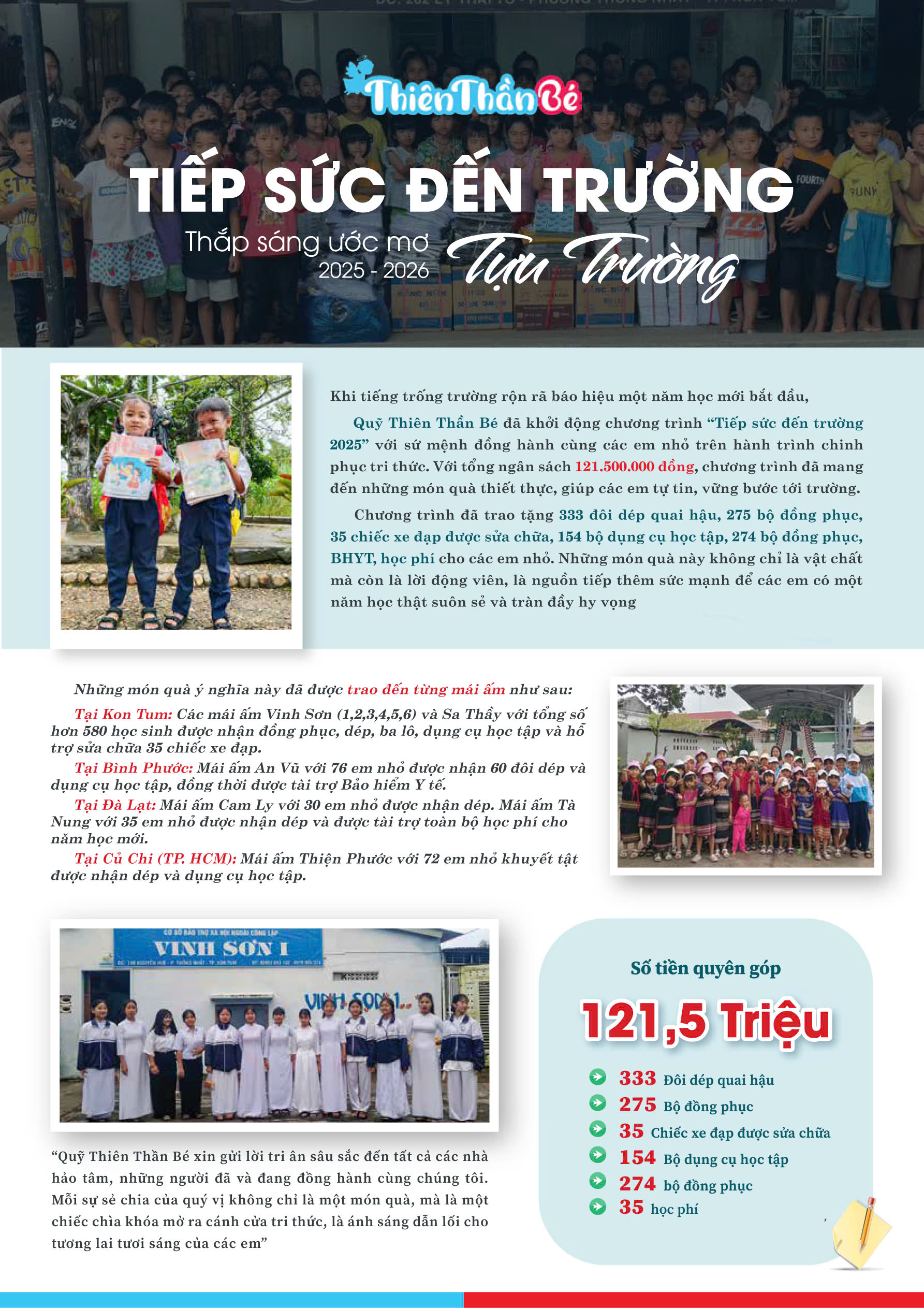 Đây không phải thành tích của Thiên Thần Bé. Nhưng là gom nhặt những yêu thương của các cô chú, anh chị dành cho những mái ấm tình thương, những hoàn cảnh đặc biệt cần được lưu tâm ở cả 3 miền.